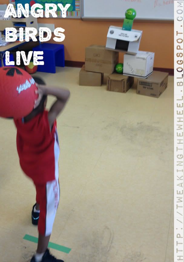 here! I decided to assess gross motor skills for the end of the year by making Angry Birds Live in my classroom. I had many reasons for choosing Angry Birds Live: I had to pack up my classroom so I had tons of boxes laying around, I wanted a fun way to assess their ability to throw a ball at a target, my students love Angry Birds, and well it just looked fun!
