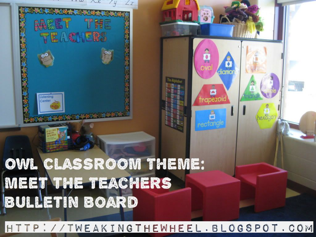 This bulletin was pretty lame and this is a picture of it before it was done. You do get an interesting shot of the listening center and part of the dramatic play area of my room. Anyways, the bulletin had the Carson Dellosa owl notepad owls with each "teacher's" name and then a photo of the teacher next to the owl holding their name written on a chalkboard just like the kids on their bulletin. And by "teacher's" I mean all of the support services that pop in and support a special needs/ ELL class of 4 year olds, like Speech, OT, PT, audiology, ELL, Special Ed teacher and aids, etc. I swear my classroom needed a revolving door for the number of people that came in and out during any given day...